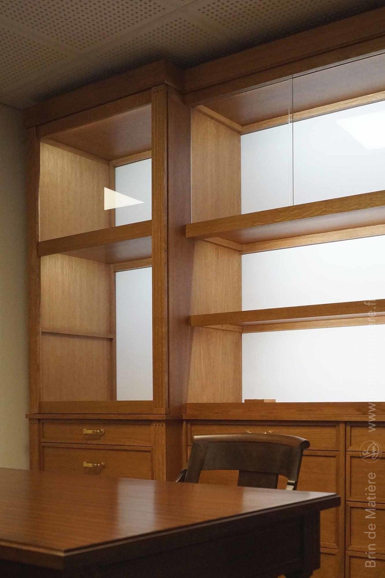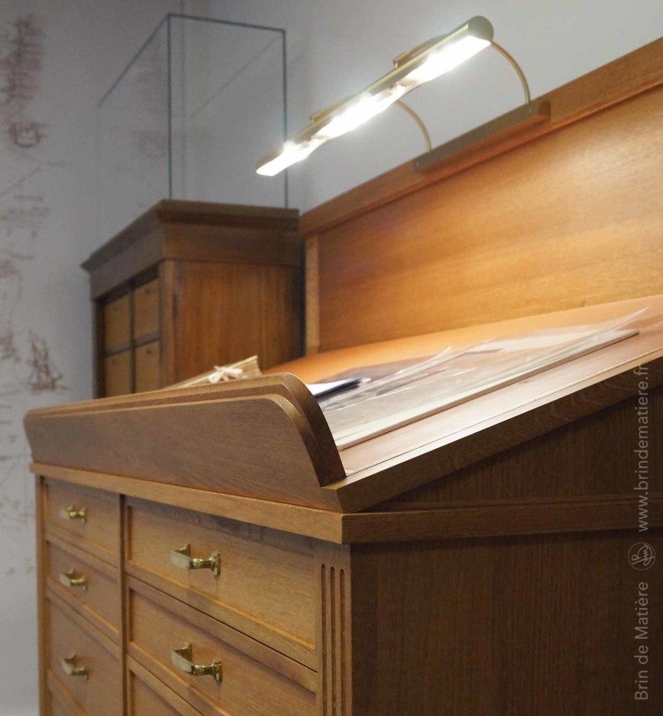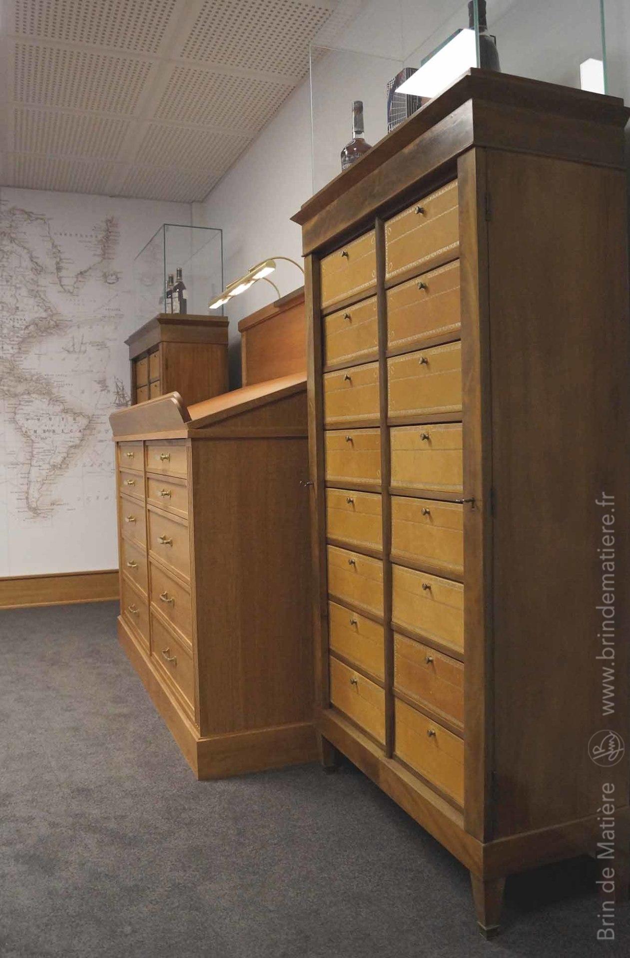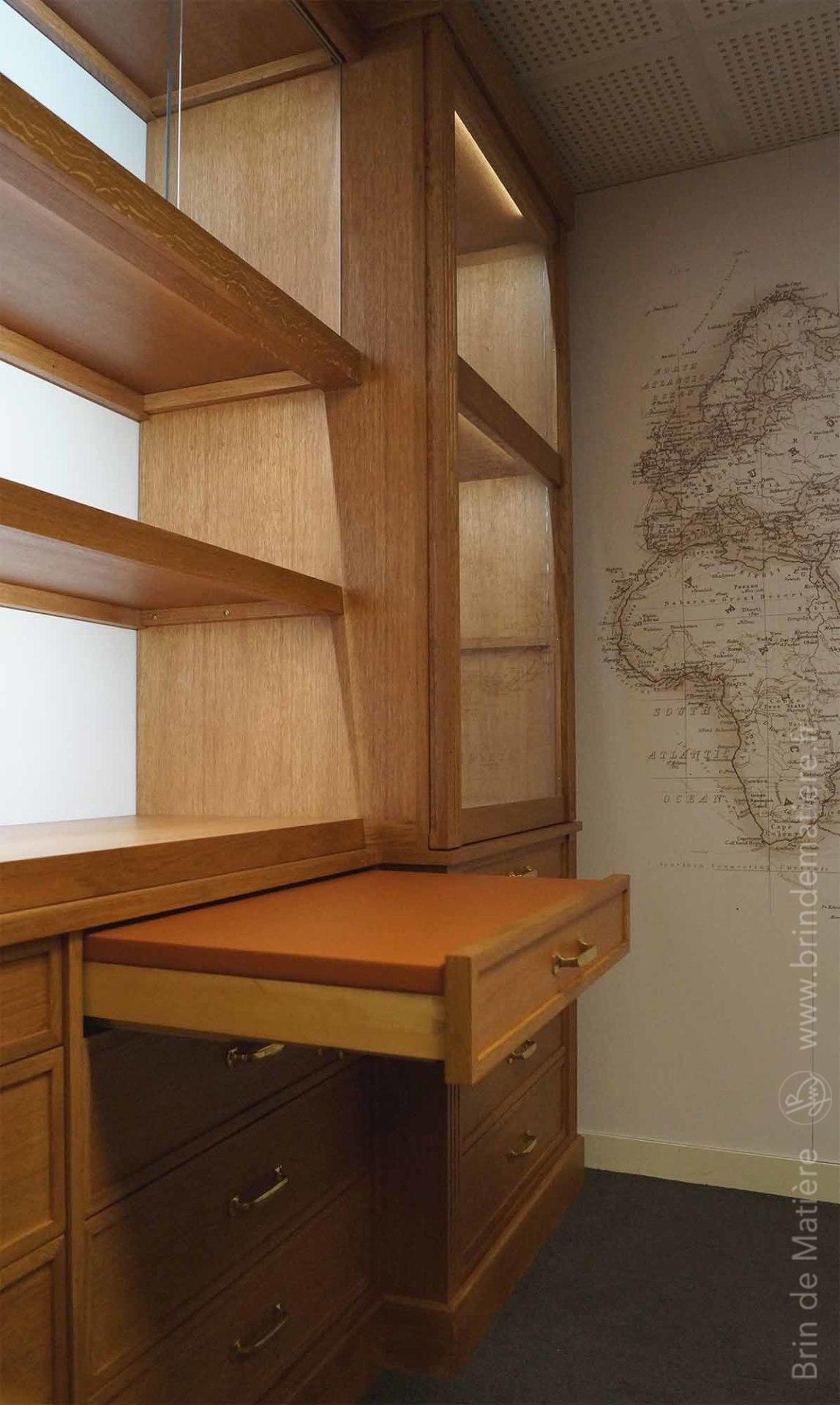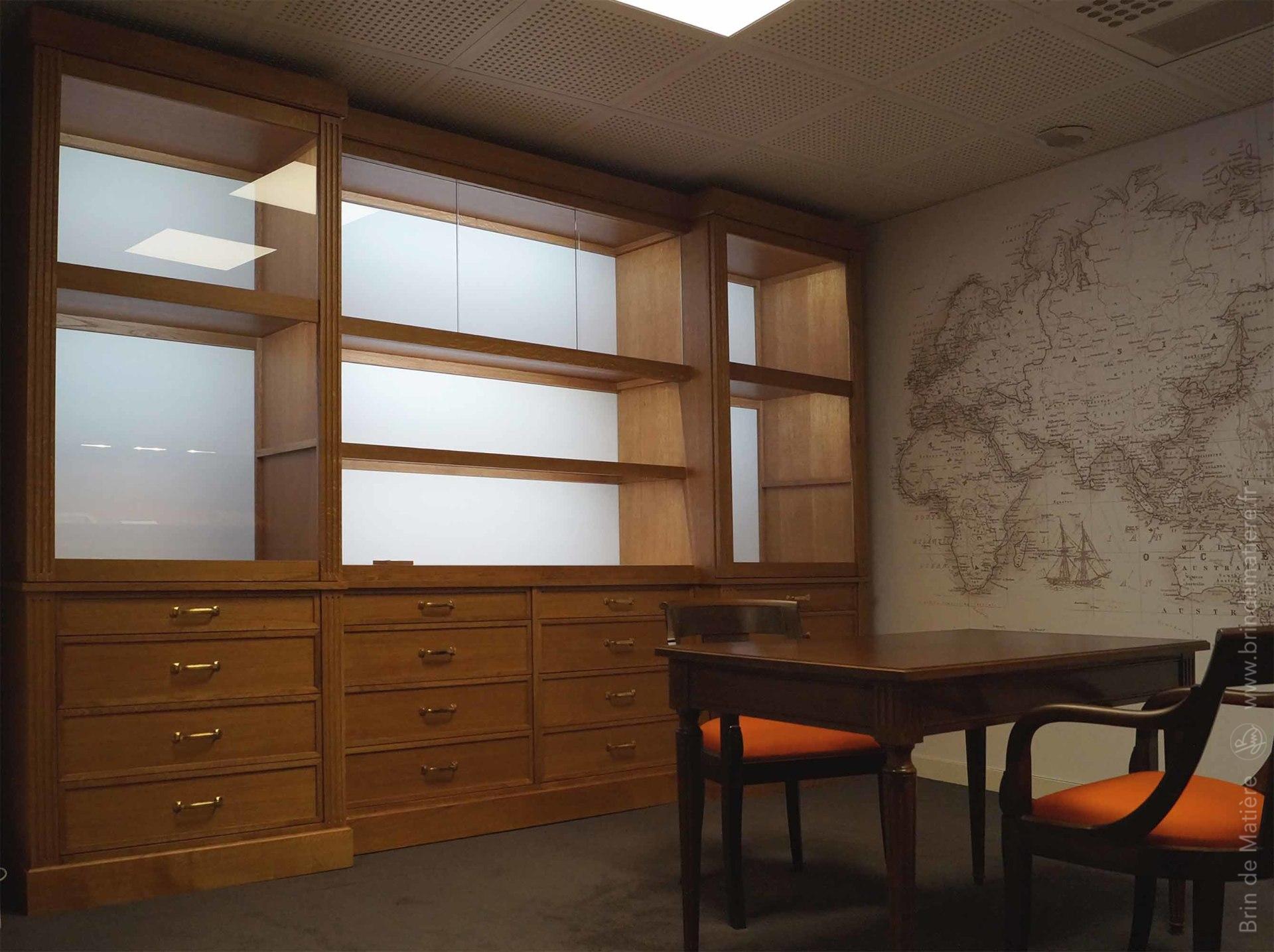 Ensemble de mobilier d’inspiration 19ème pour la mise en valeur d’objets de collection et la consultation d’archives. Mobilier professionnel sur mesure en chêne teinté dessiné et réalisé par les ateliers Brin de Matière suivant les préconisation d’un architecte décorateur.