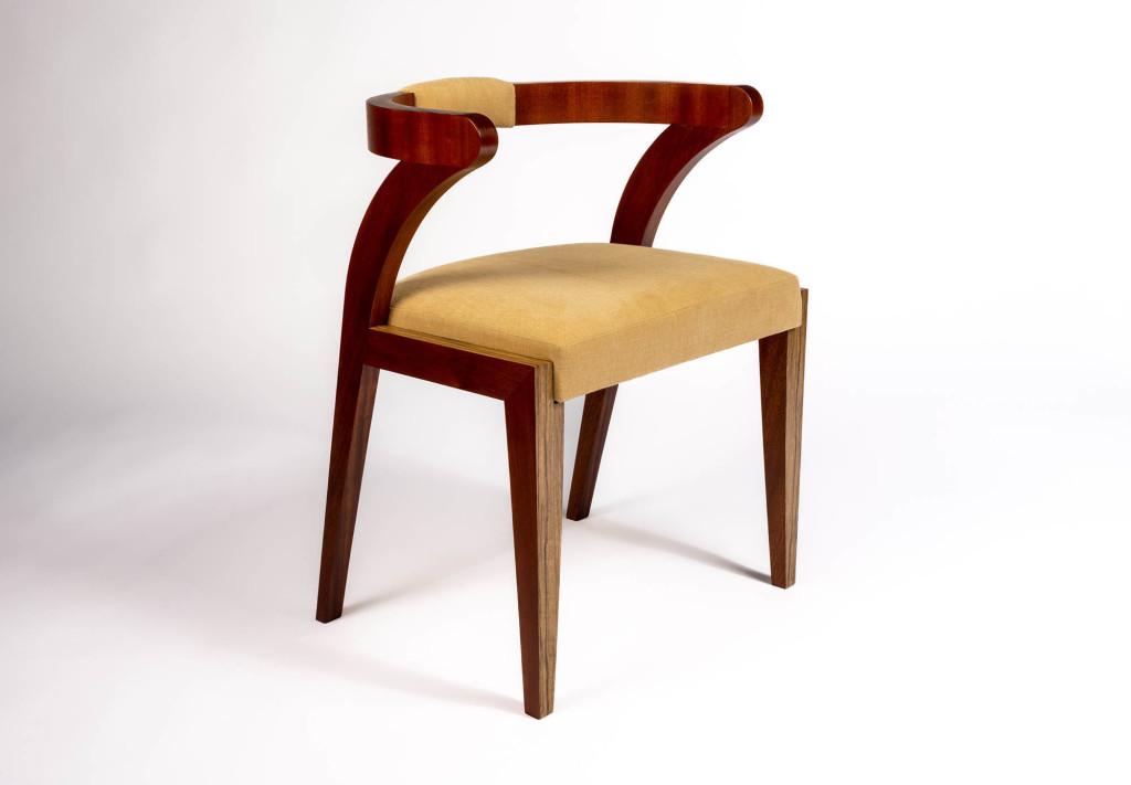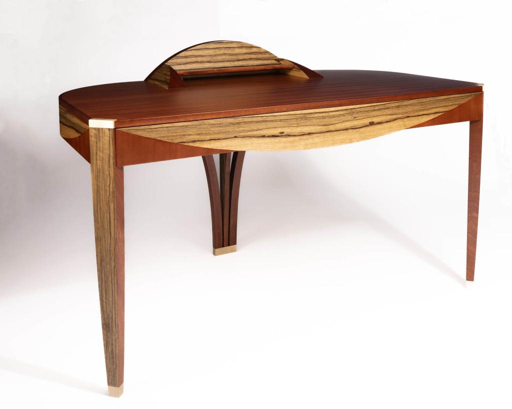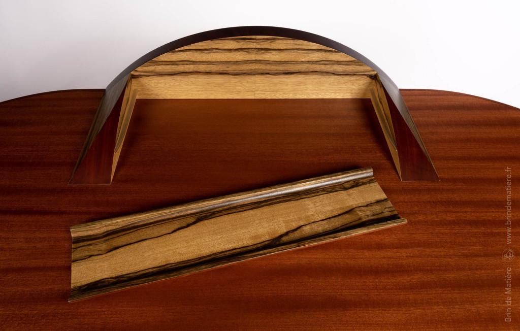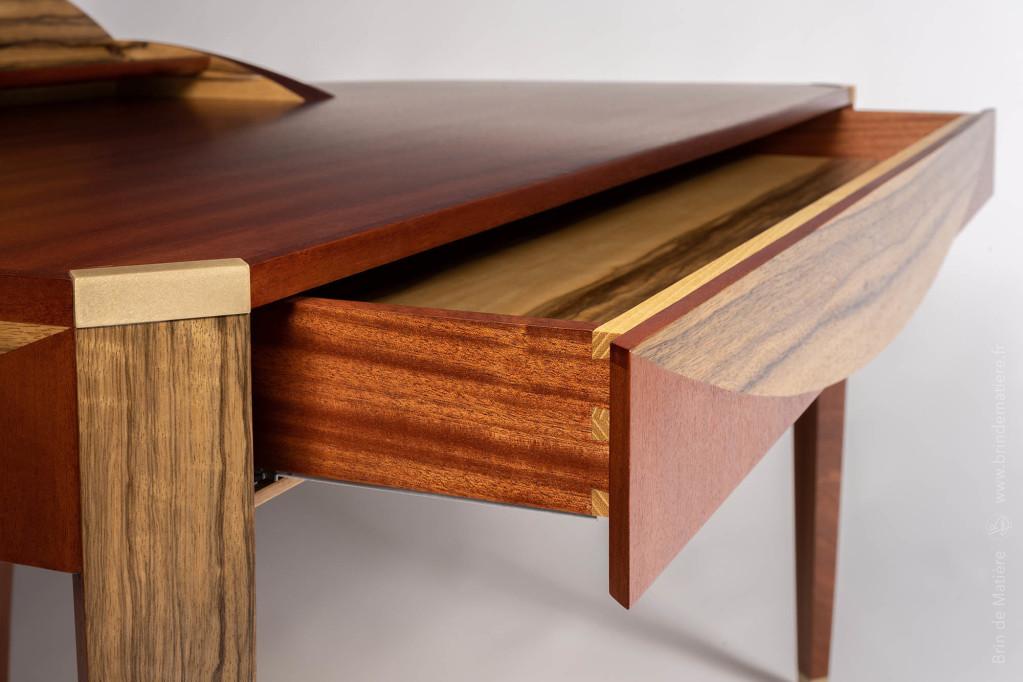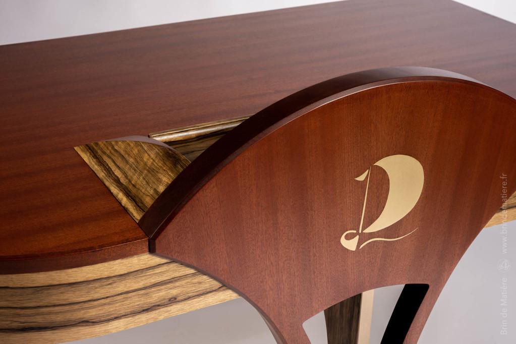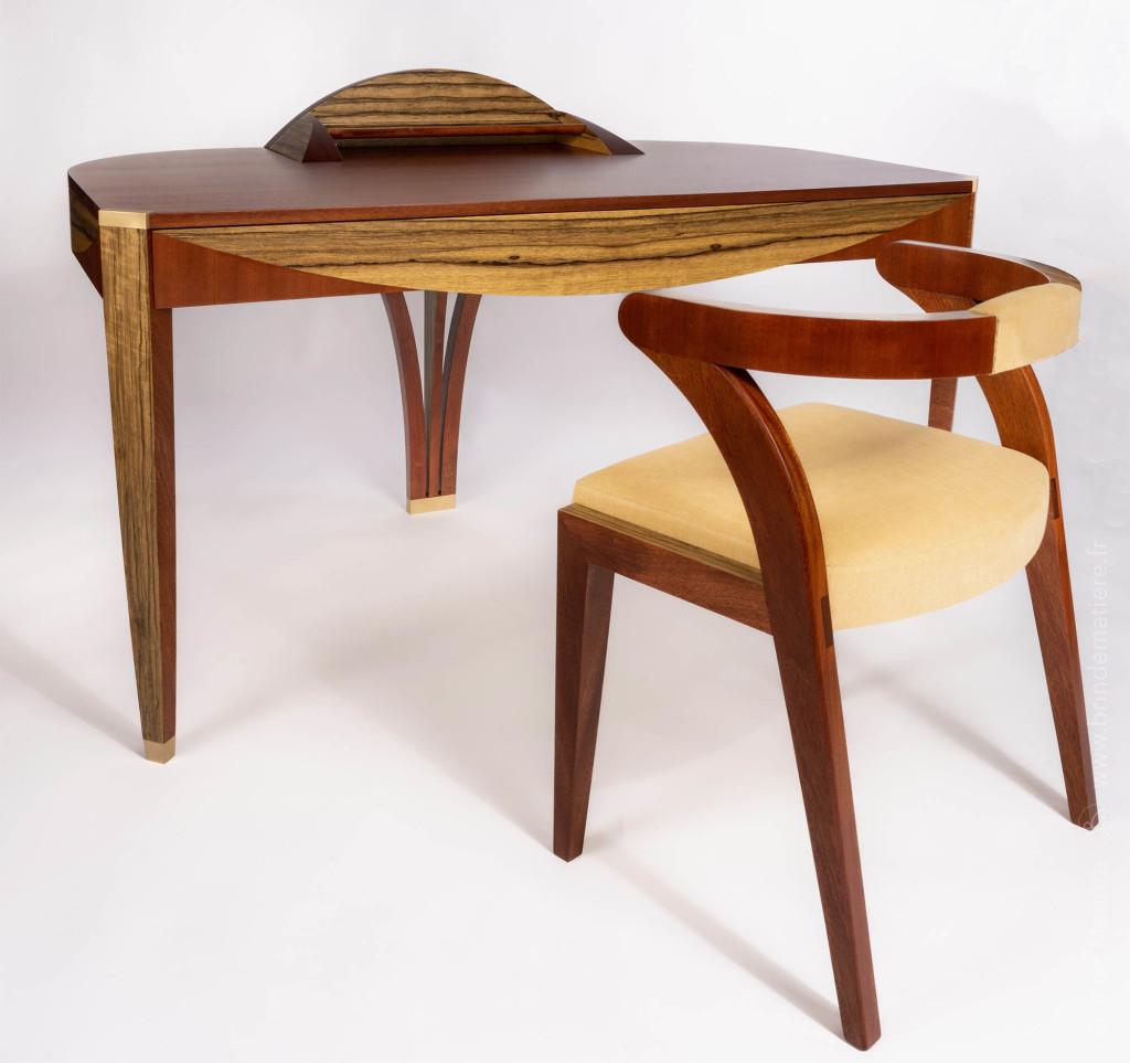 Bureau et son assise sur mesure en acajou et fraké bariolé. Marqueterie laiton. Grand tiroir en façade et plumier central. Pièce sur mesure dessiné avec le client. Design signé Brin de Matière.