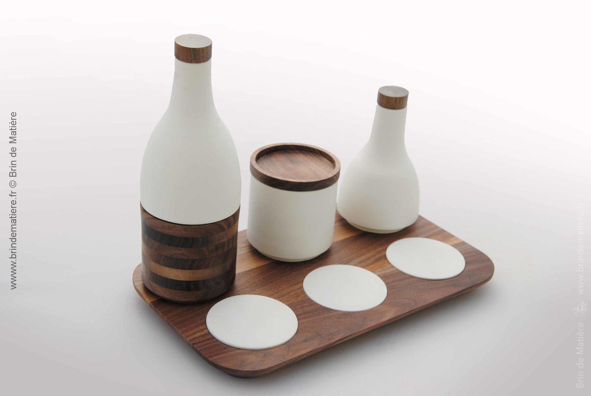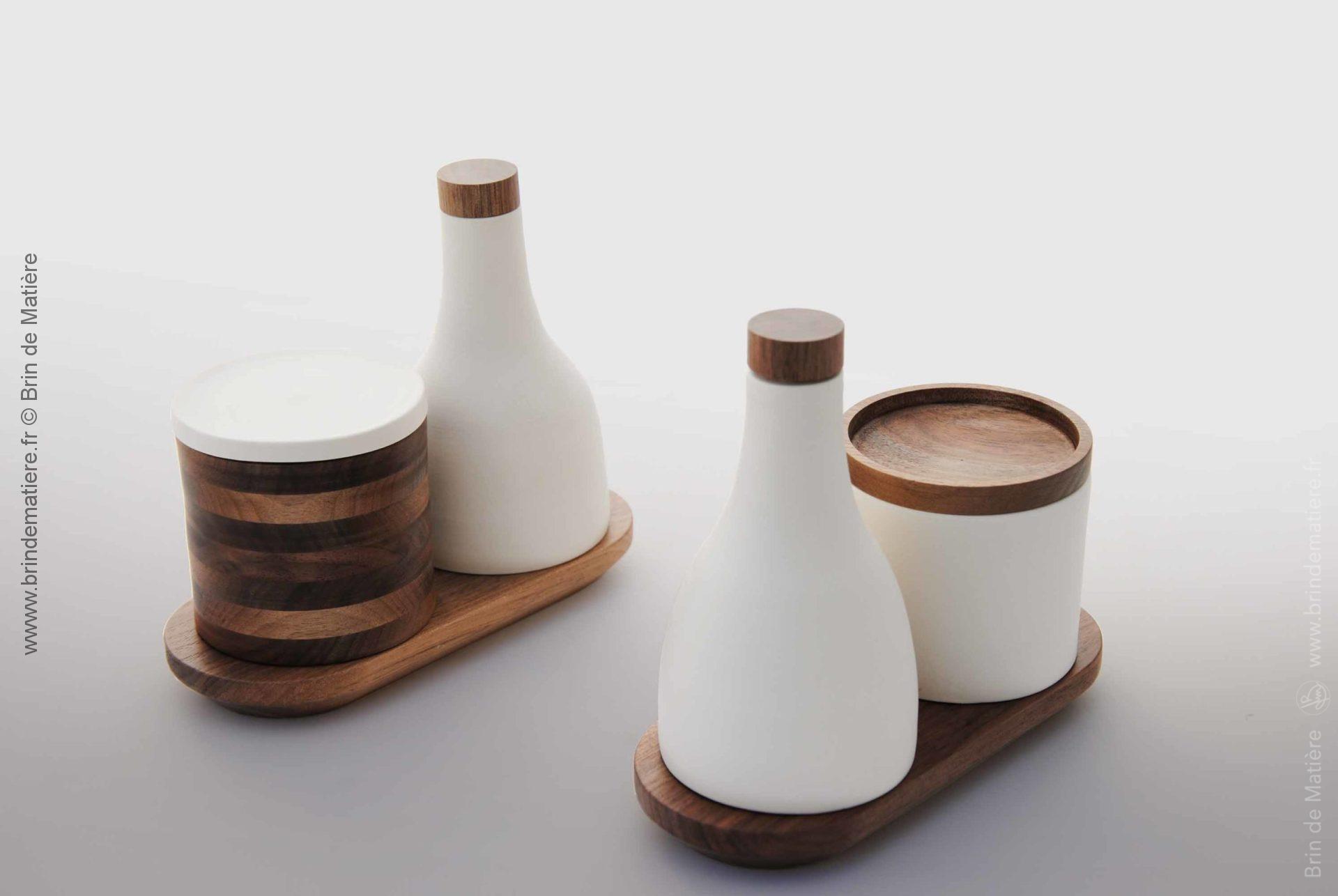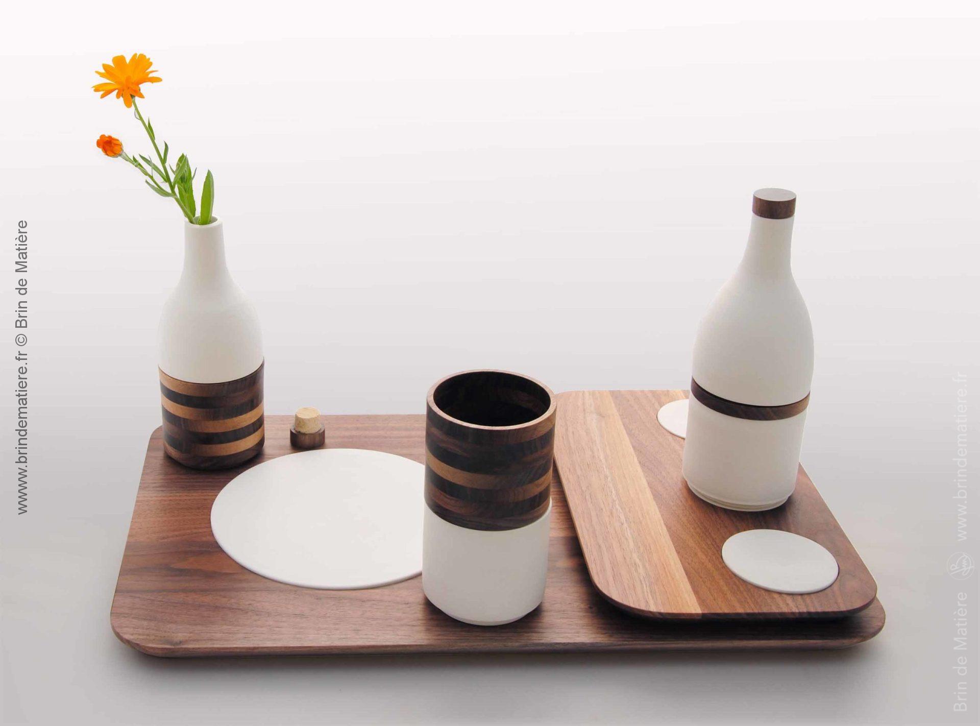 Duo porcelaine & noyer. Projet de design autour des arts de la table créé avec Isabelle NADEAU céramiste installée à Saint Jean d’Angély. http://www.terresdangely.com/fr/