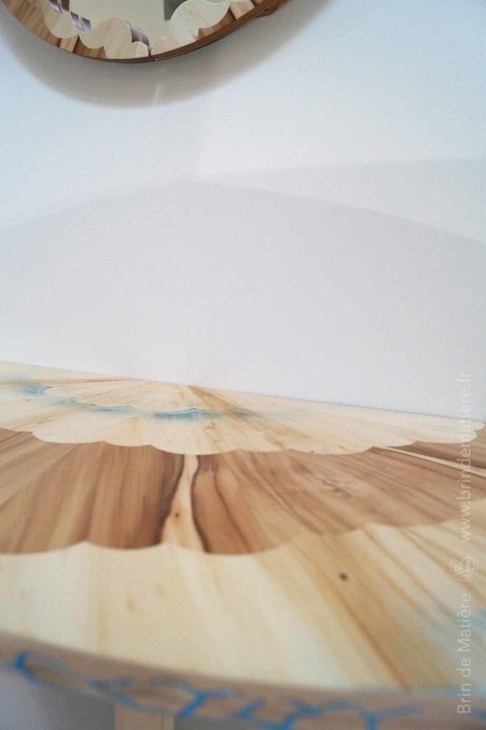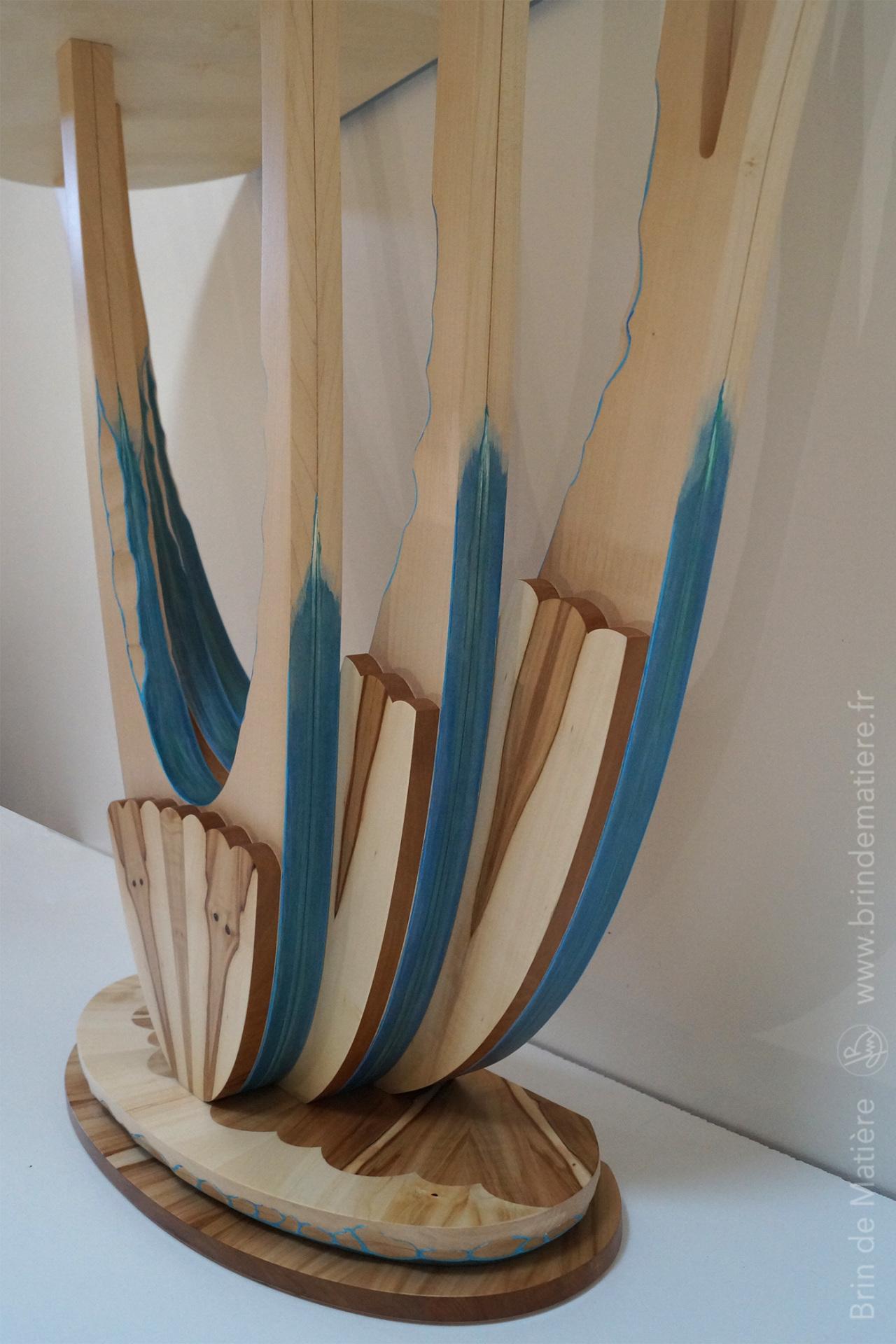 Pièce d’ébénisterie en bois d’érable, de poirier et placage de marronnier. Ensemble stylisé au marqueur acrylique, puis vernis.