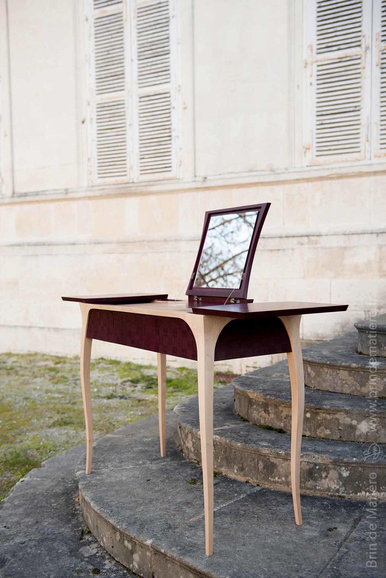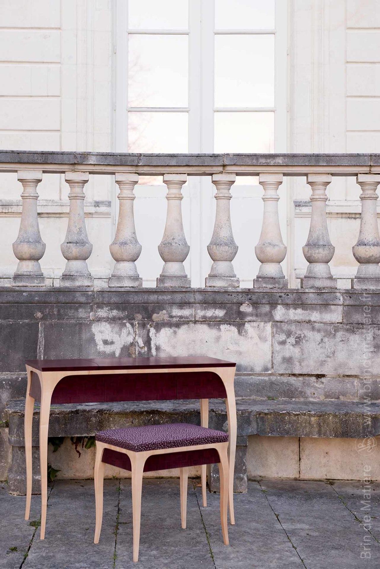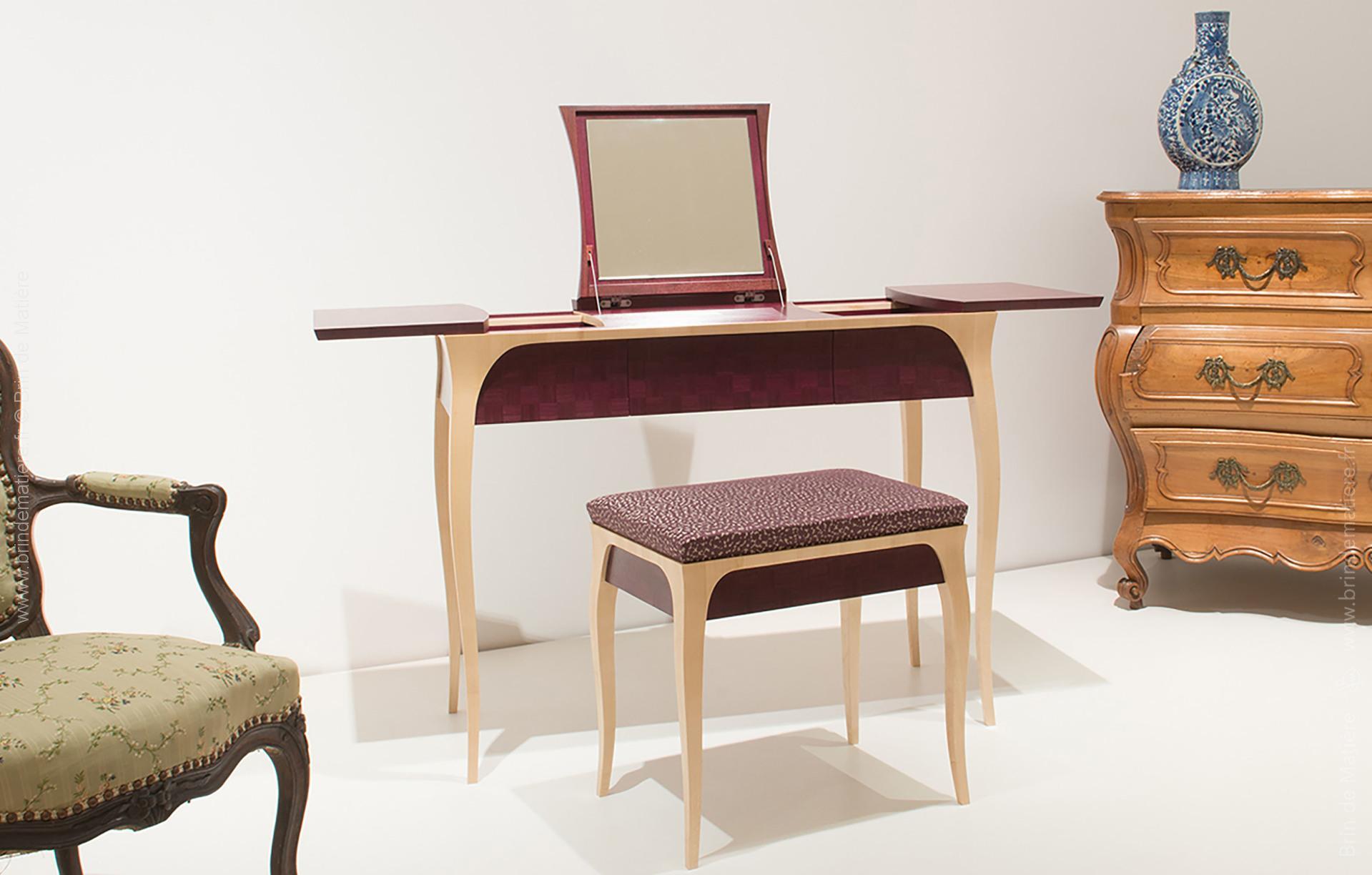 Coiffeuse contemporaine accompagnée de son tabouret empruntant leur poésie aux meubles du 18ème. Les courbes des pieds couleur ivoire étreignent l’enveloppe du meuble marqueté d’un damier couleur rouge prune.