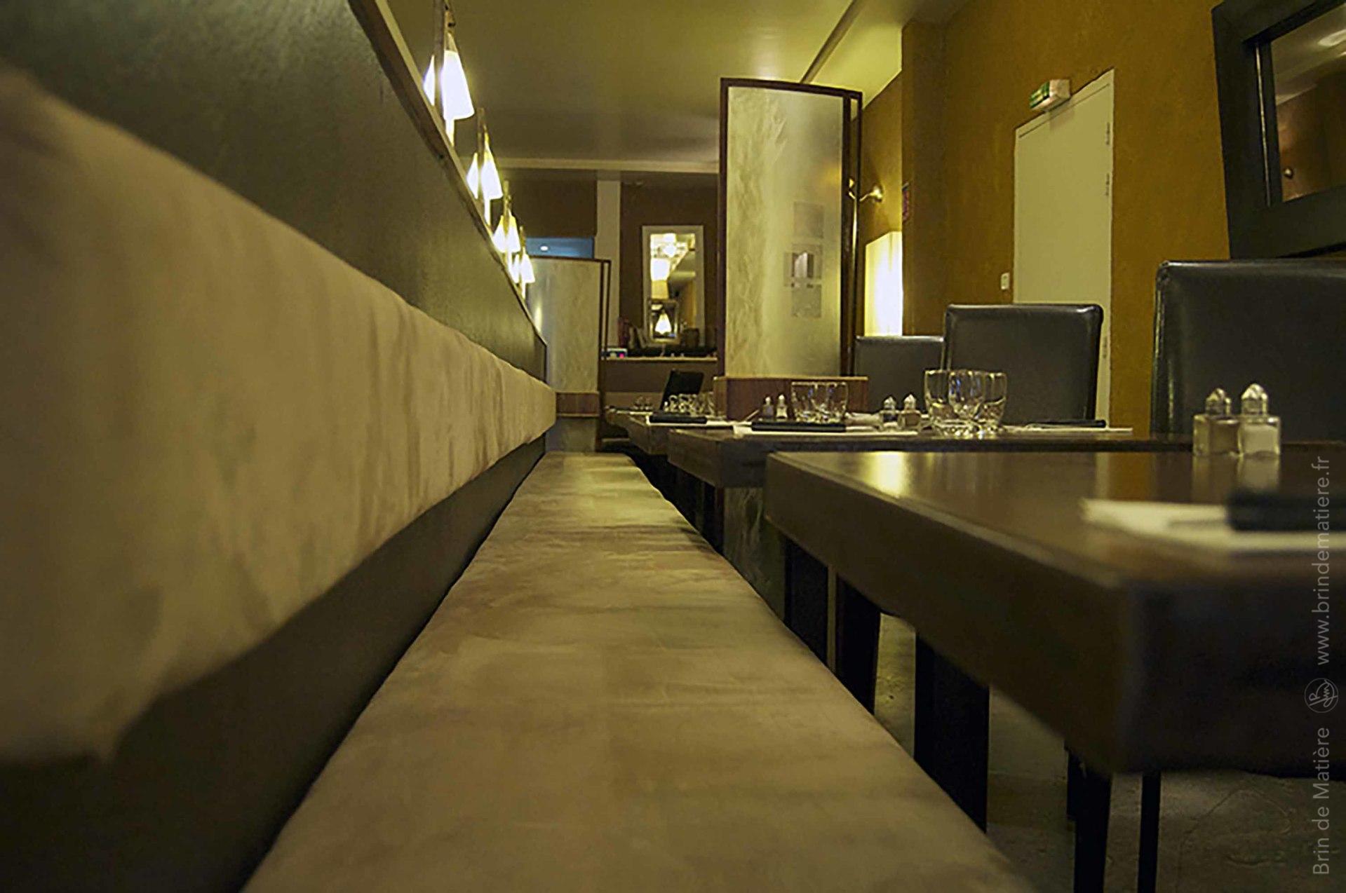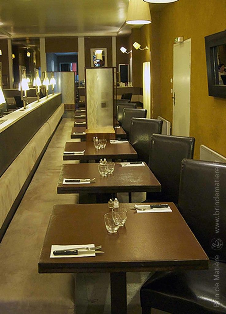 Etablissement à la décoration intérieure contemporaine. L’espace vit de formes et impressions complémentaires tels que les tissus les plus pauvres conjugués aux plus fastueux, les matières rugueuses mêlées aux plus douces, l’acier au verre, l’asymétrique au symétrique, l’ombre à la lumière, le transparent à l’opaque, le visible et le caché…