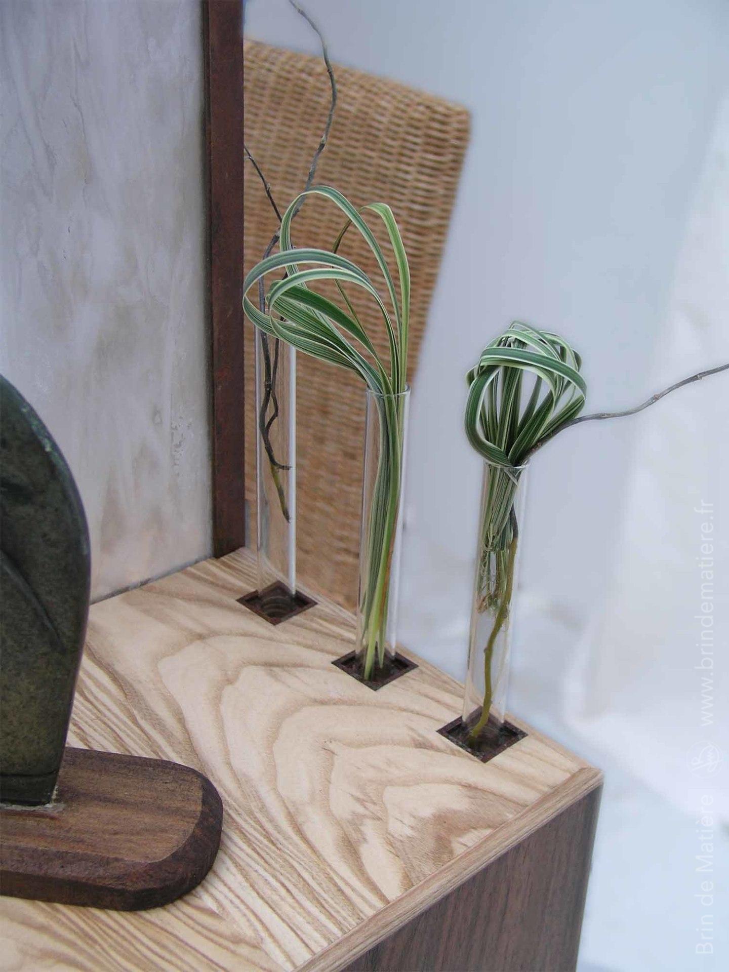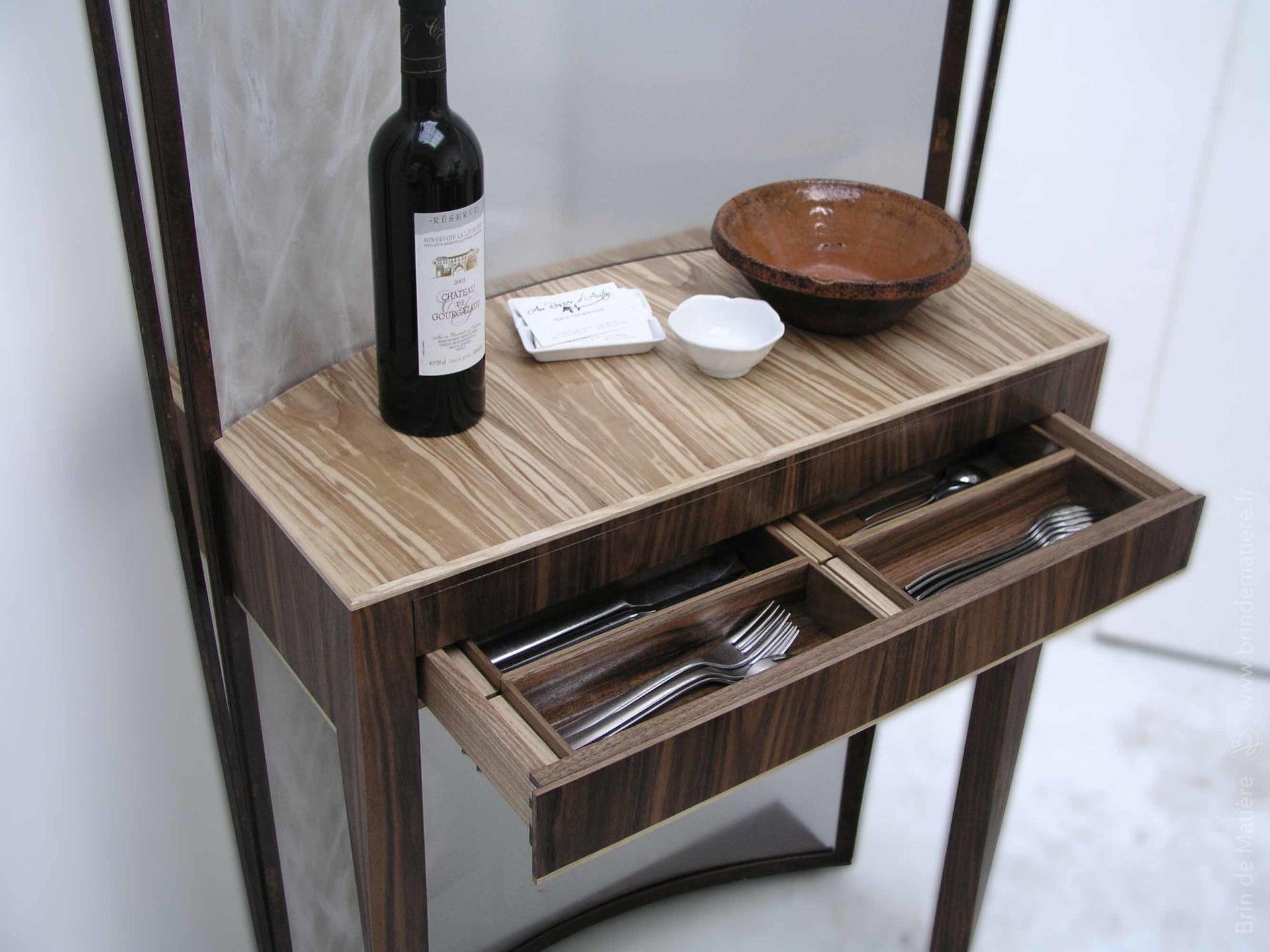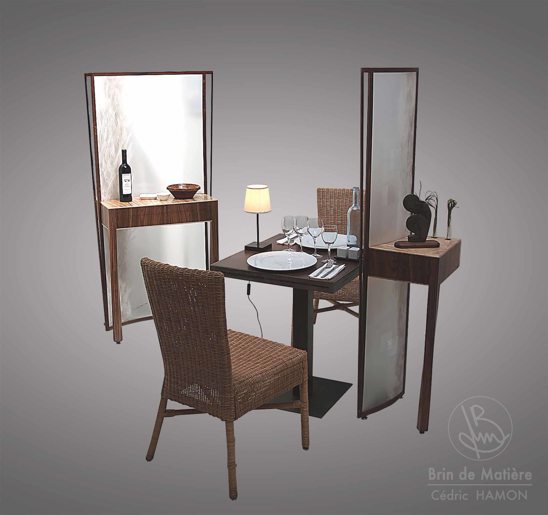 Ces éléments, composés d’acier oxydé, de polycarbonate, de frêne olivier et de noyer, permettent à la fois d’exposer des pièces d’art, de desservir les tables et de séparer les espaces.