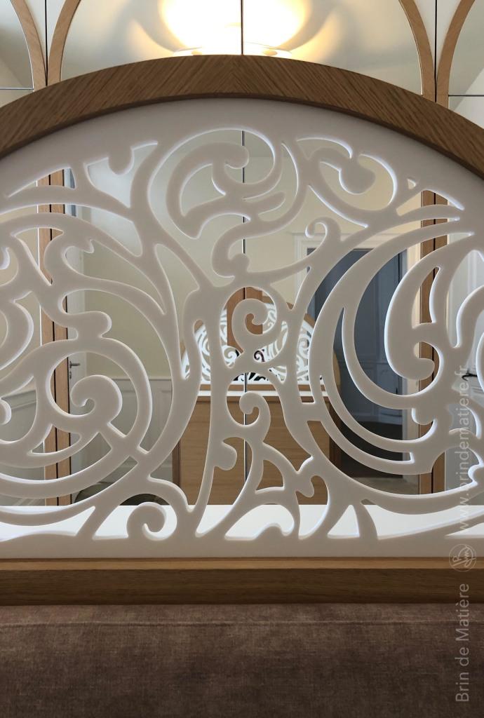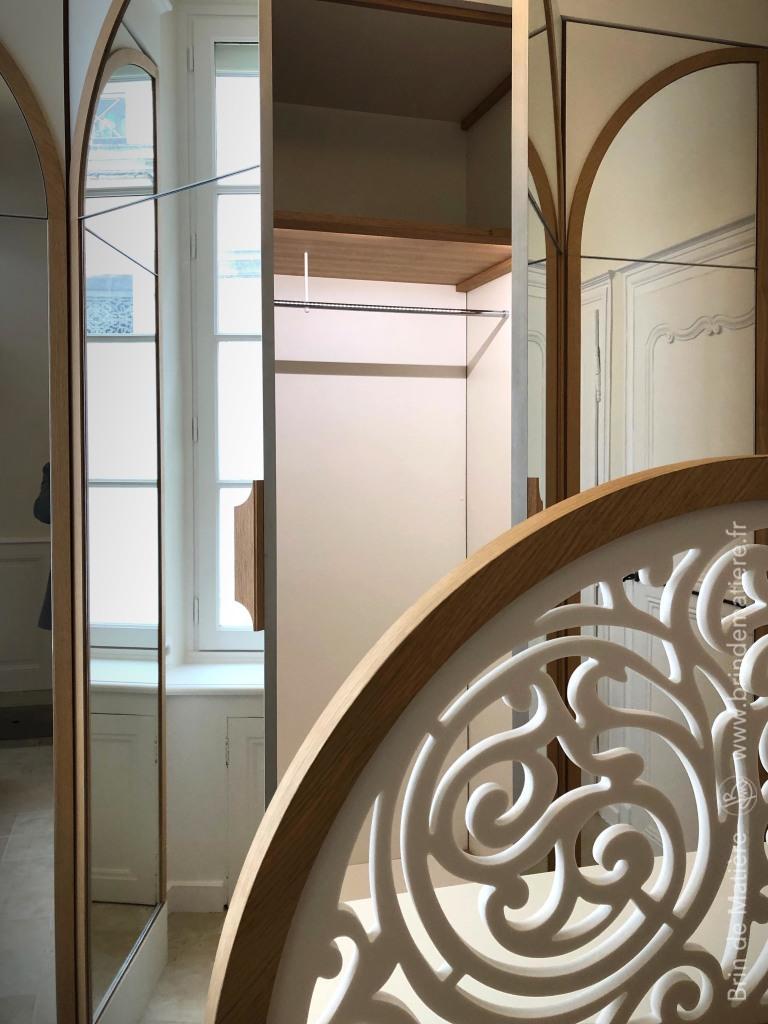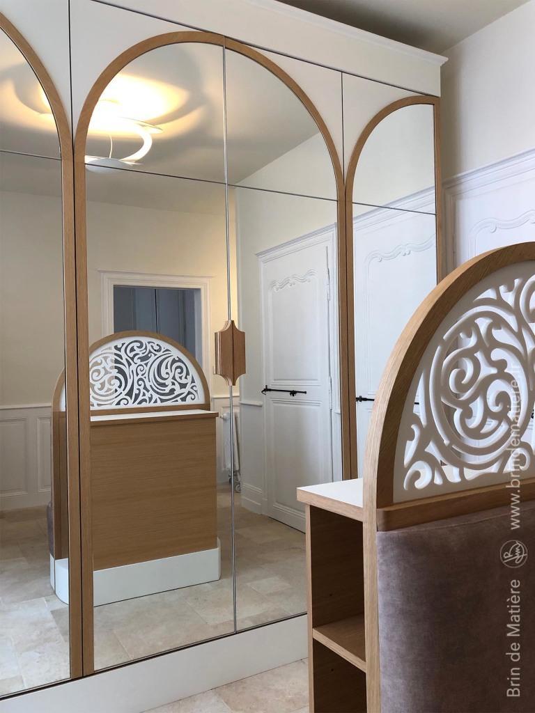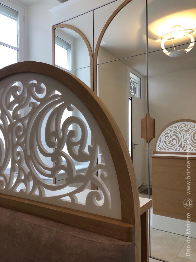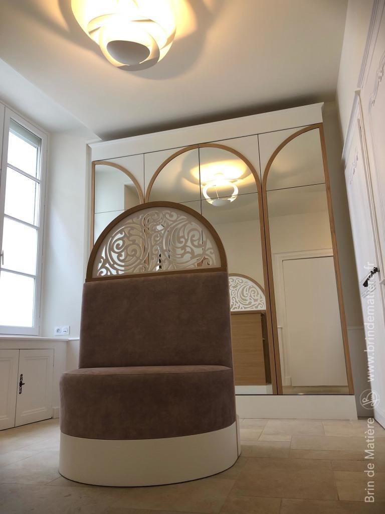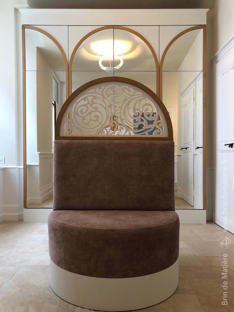 Hall d’entrée avec banquette d’accueil et son dressing à miroirs. Décors d’arabesques d’inspiration renaissance. Étude d’aménagement design mobilier et réalisation signés Brin de Matière.