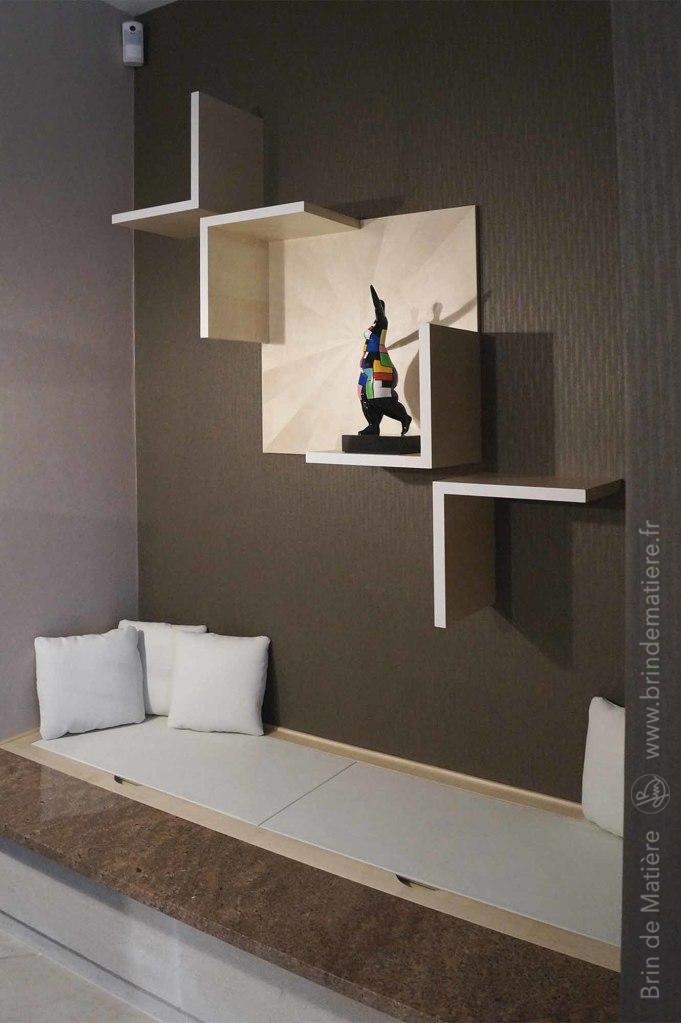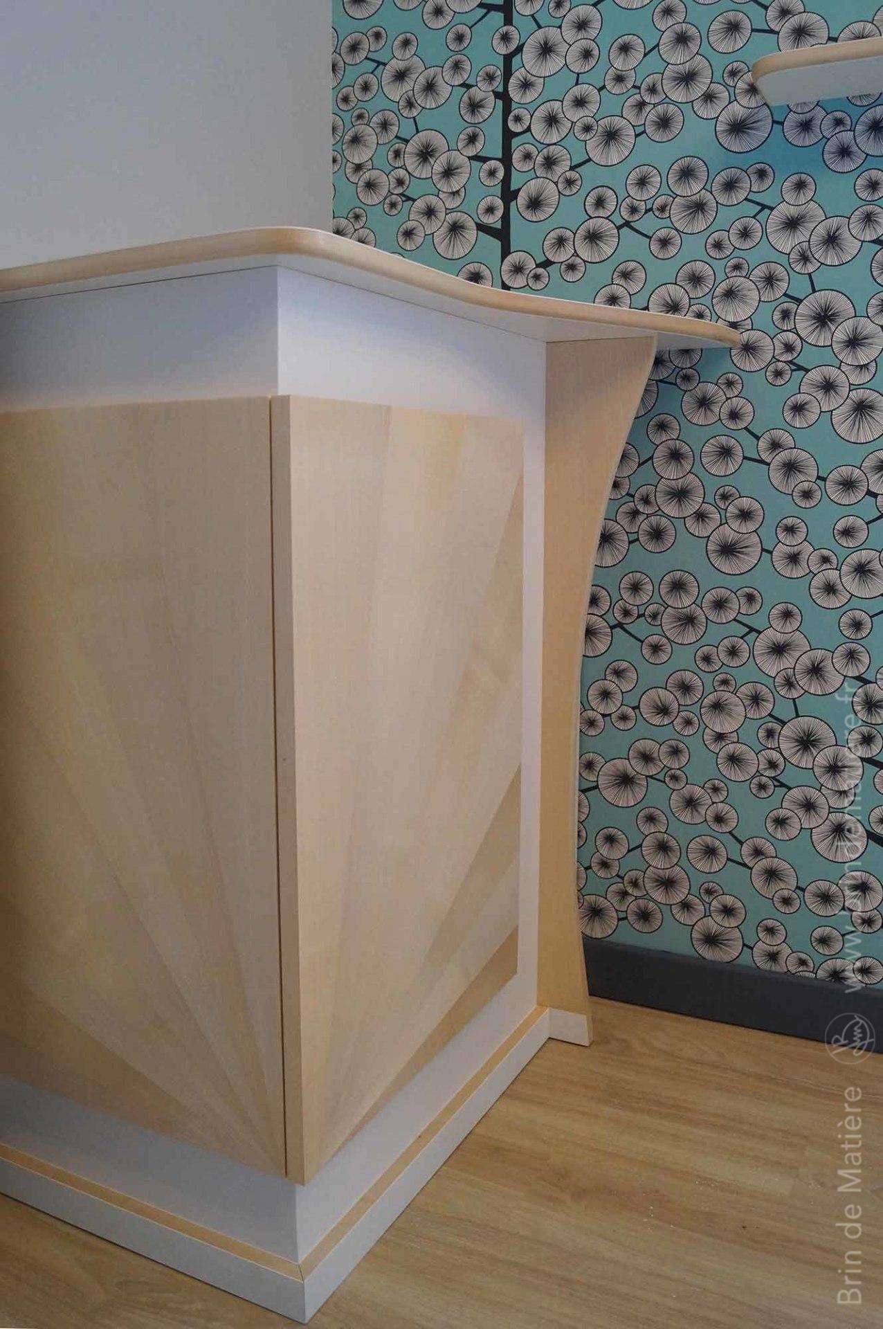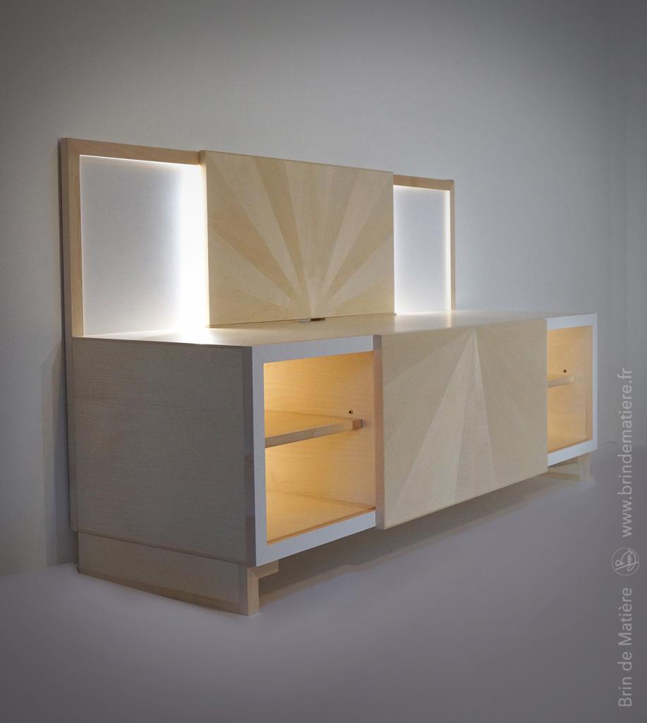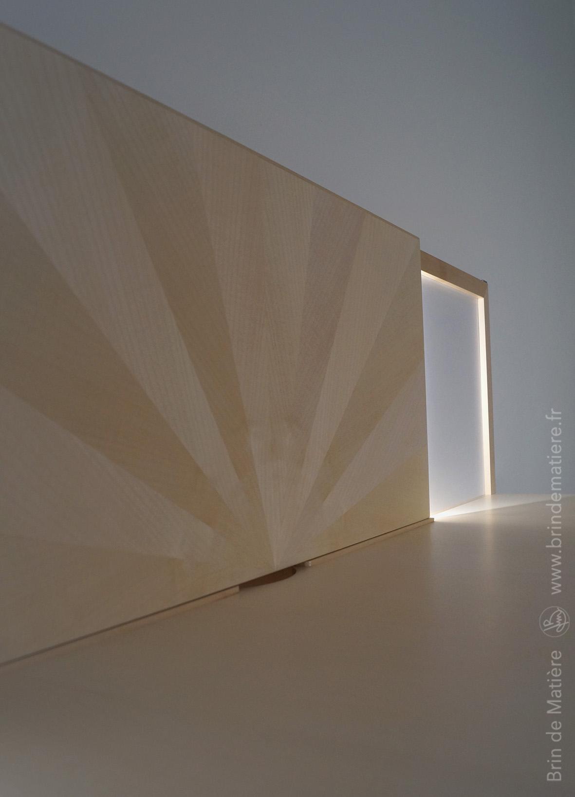 Projets divers d’agencement et mobilier sur mesure contemporain en érable sycomore : bois massif associé à une laque blanche et placage développé en motif soleil mis en lumière par sa teinte crème naturelle.