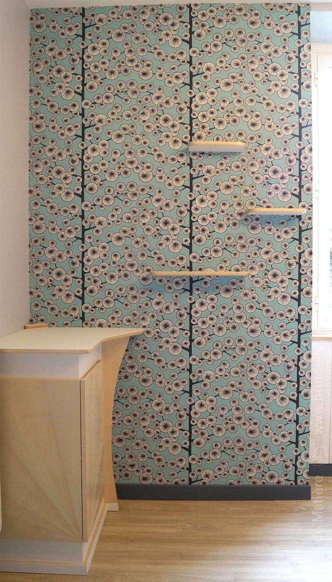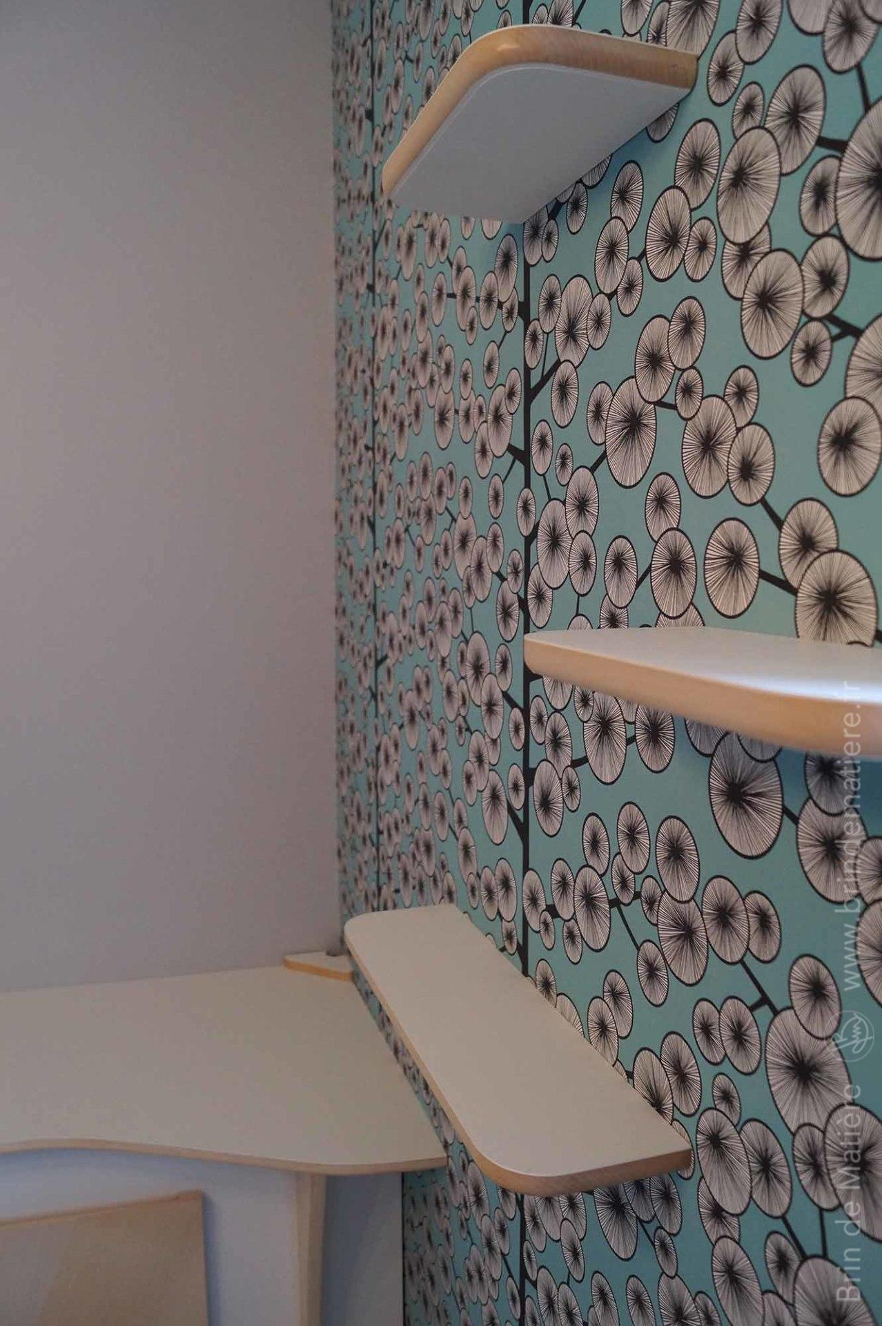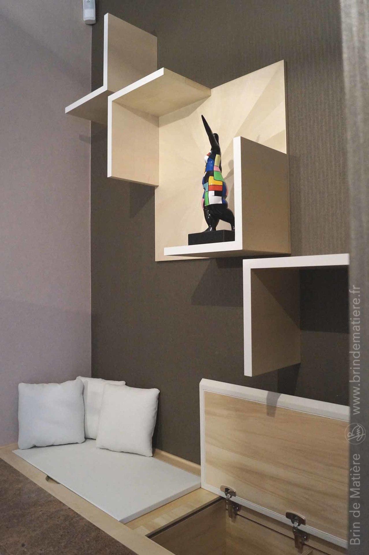 Projets divers d’agencement et mobilier sur mesure contemporain en érable sycomore : bois massif associé à une laque blanche et placage développé en motif soleil mis en lumière par sa teinte crème naturelle.