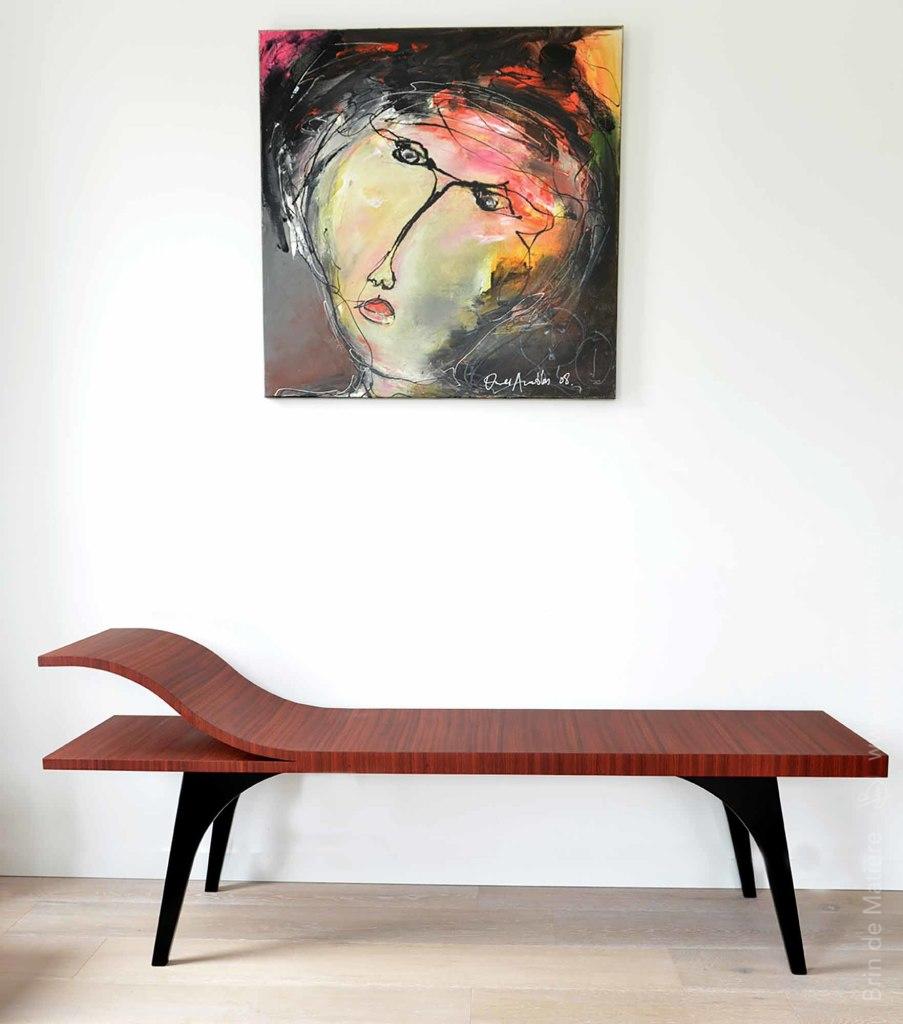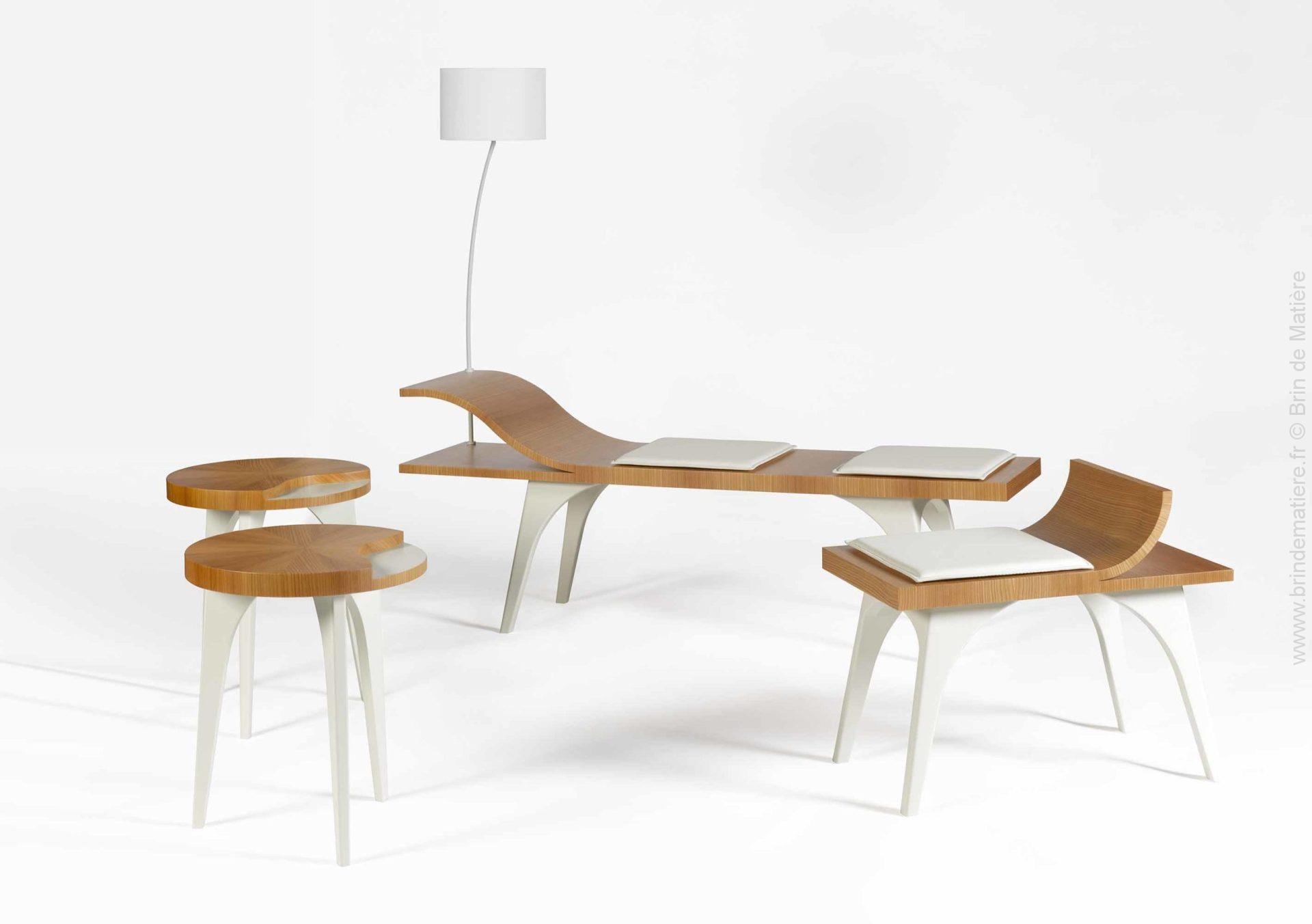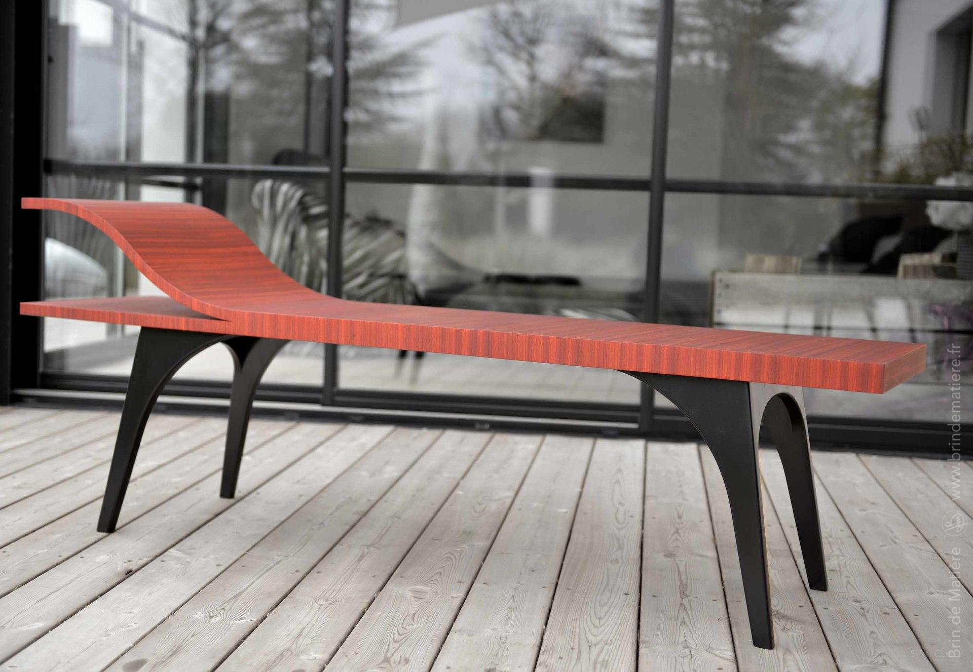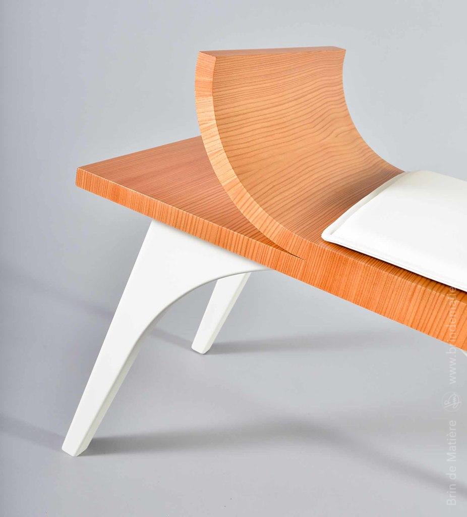 Banc pour espace d’attente ou pour l’habitat. La série « Kline » fait référence au mobilier antique romain ou grec. Placage de Mélèze (orange) ou Padouk (rouge), bois laqué et placets amovibles.