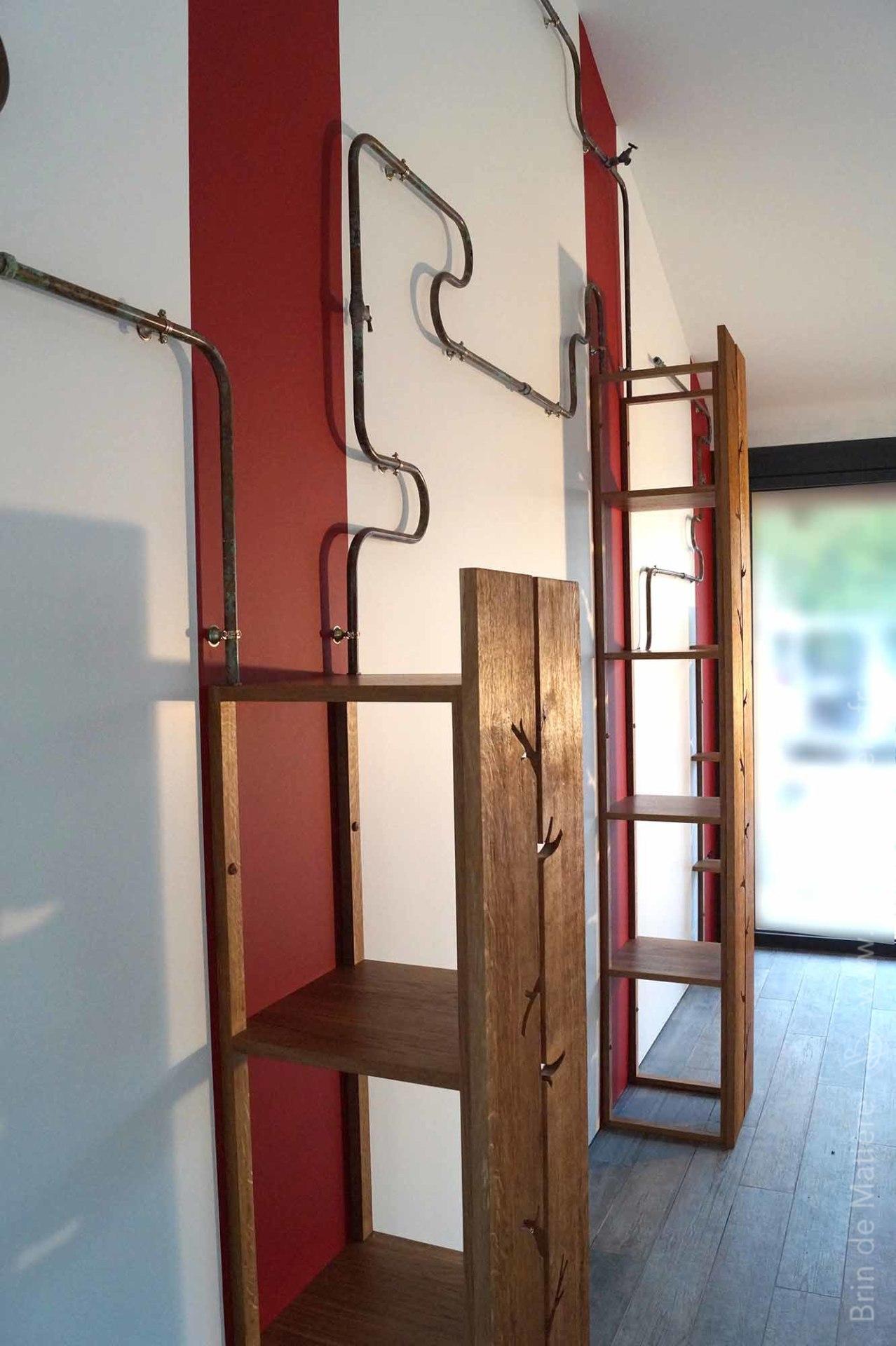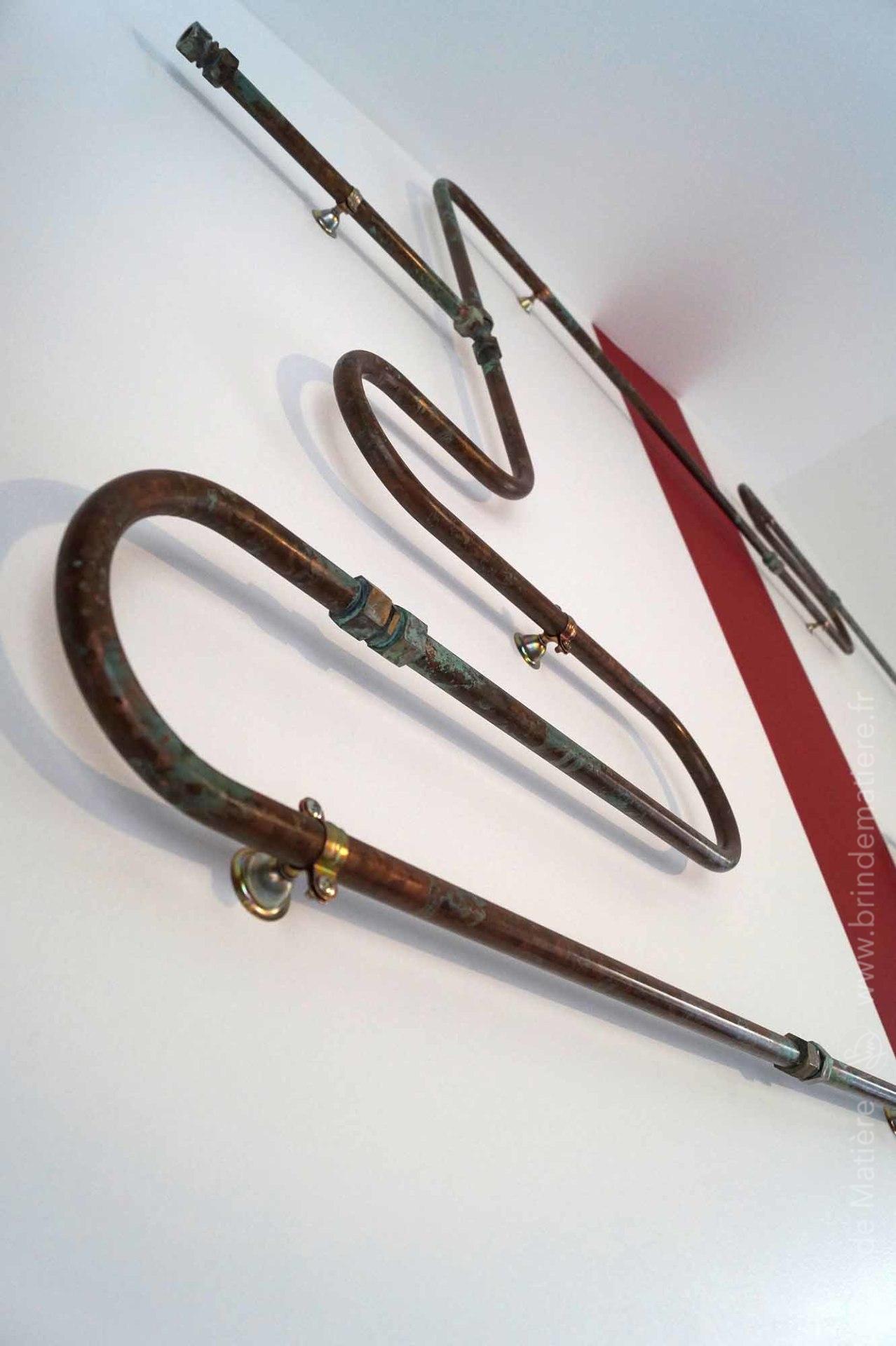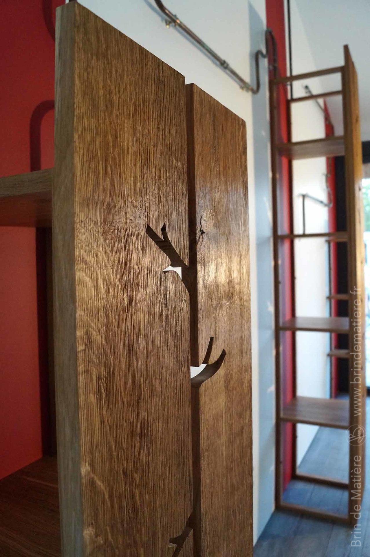 Installation murale composé de colonnes en chêne texturées et d’une structure en cuivre oxydé.