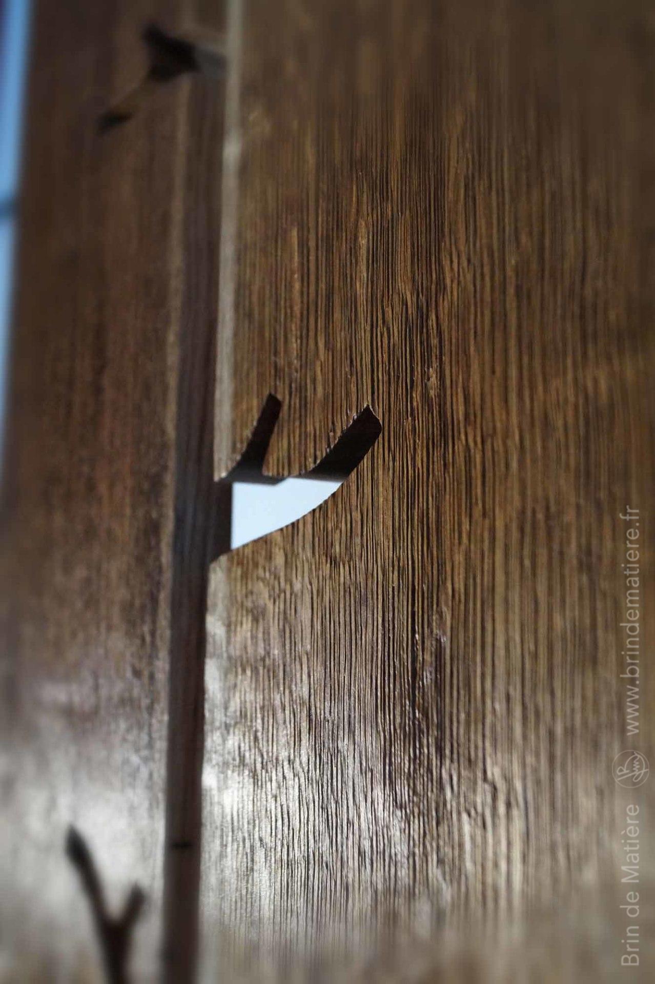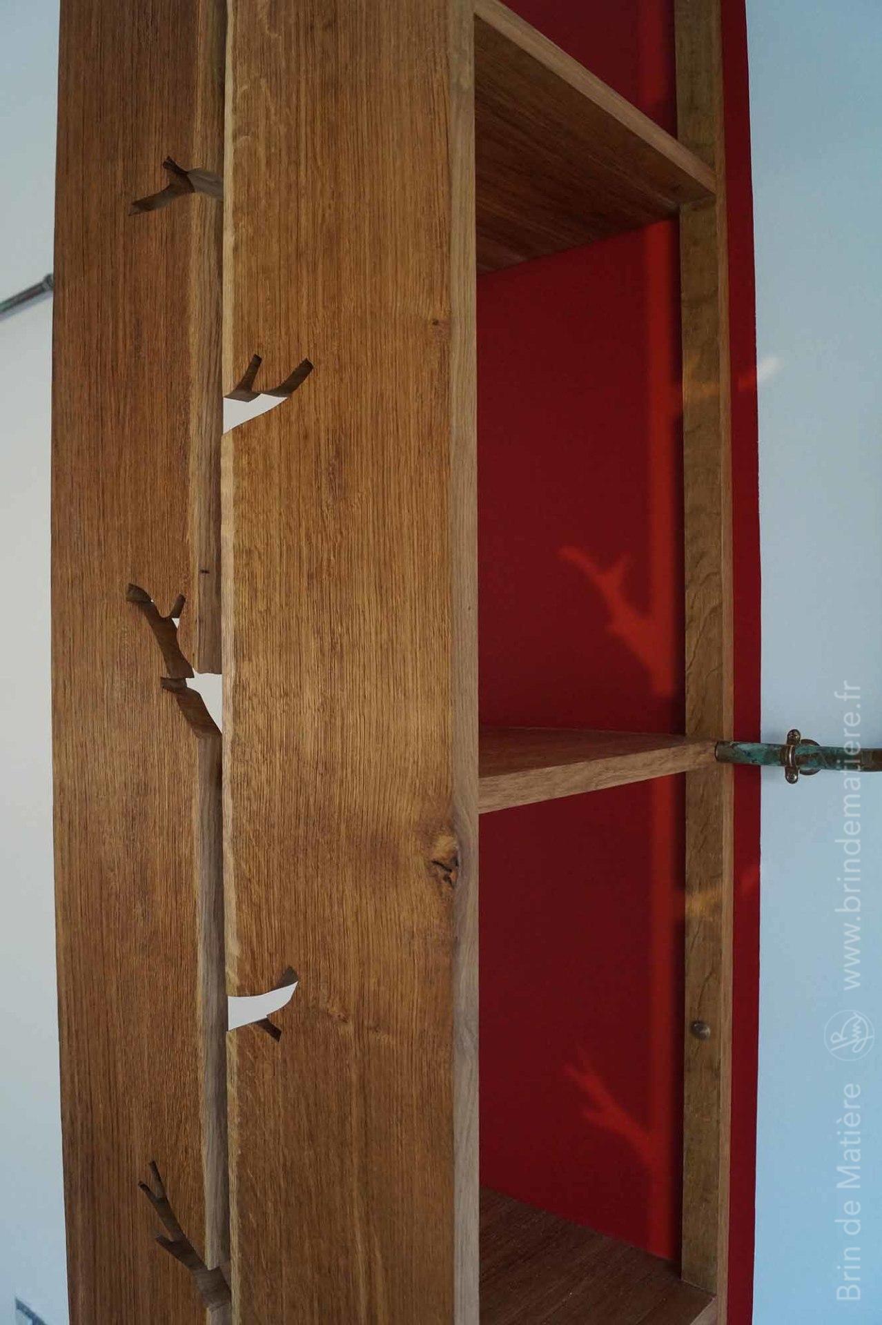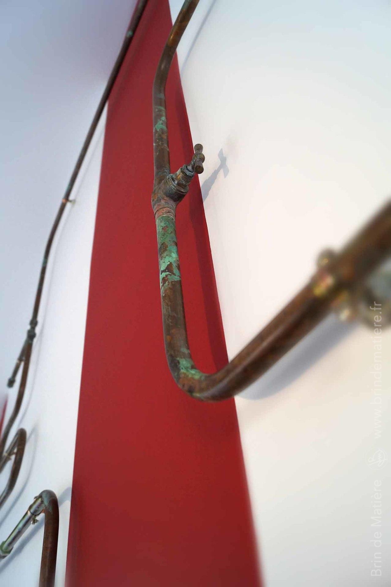 Installation murale composé de colonnes en chêne texturées et d’une structure en cuivre oxydé.