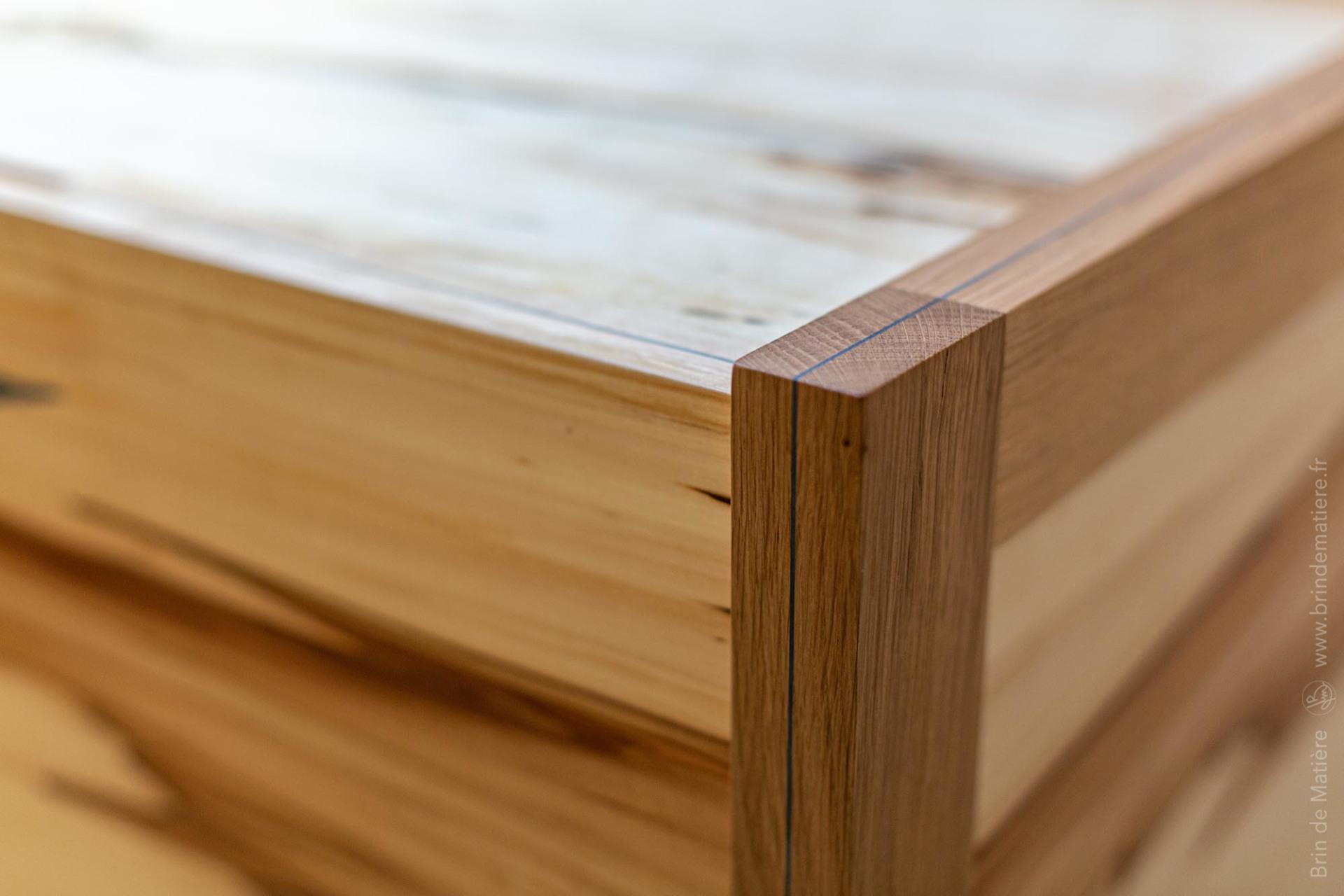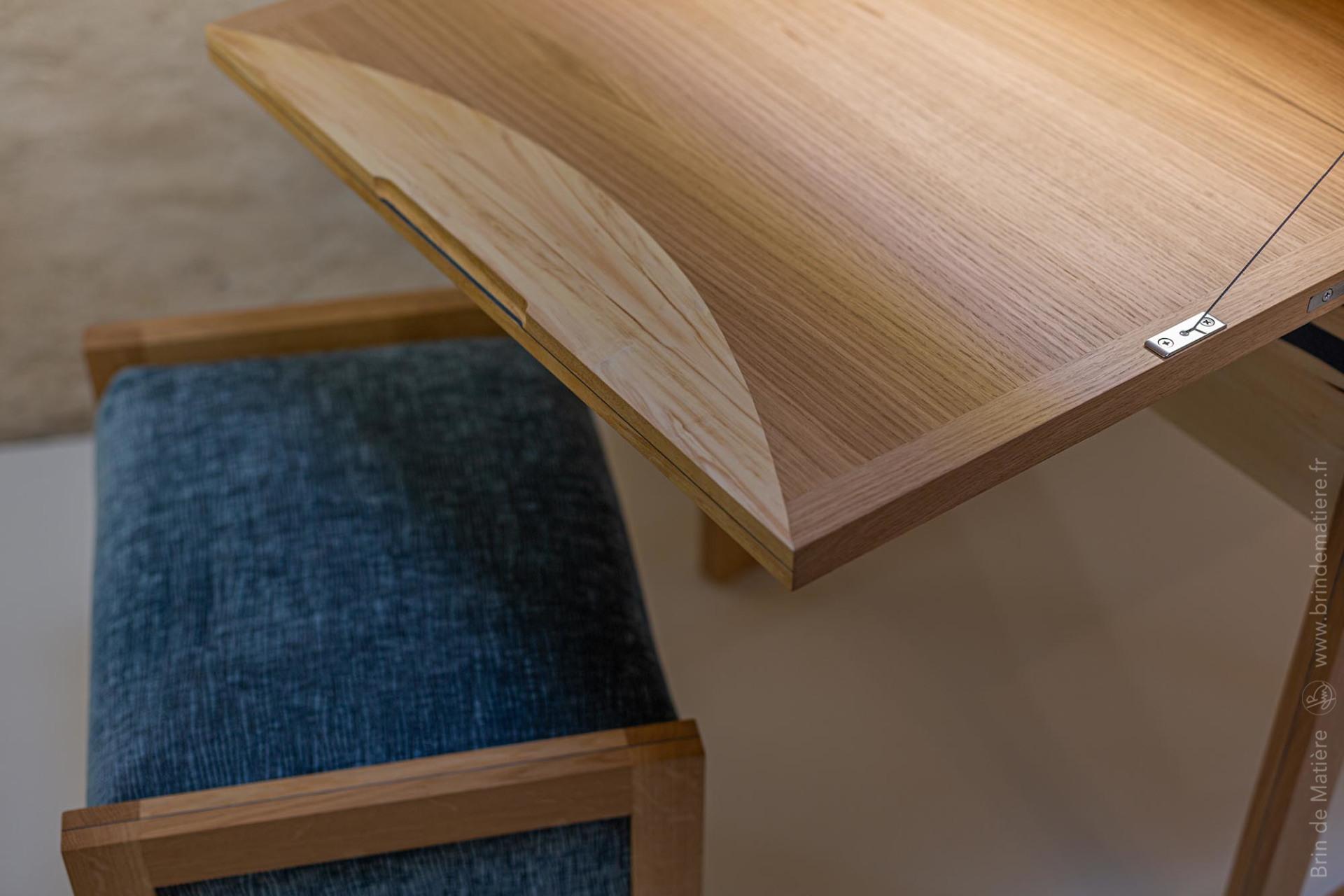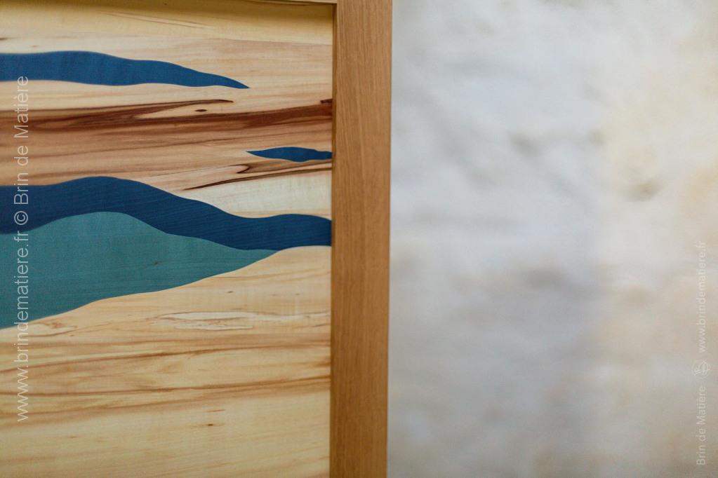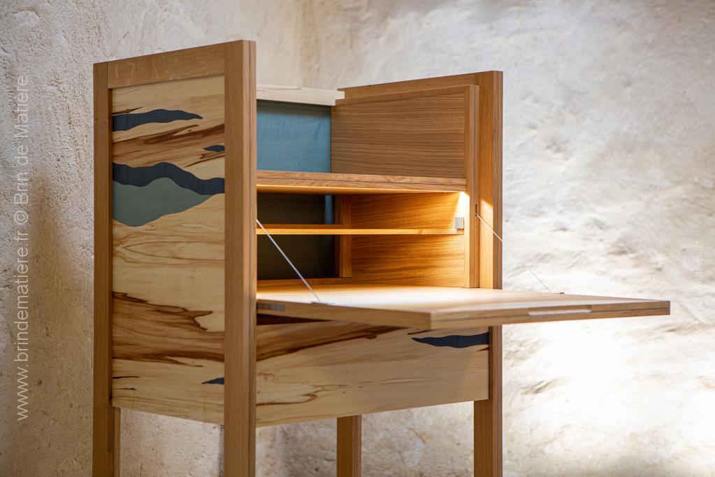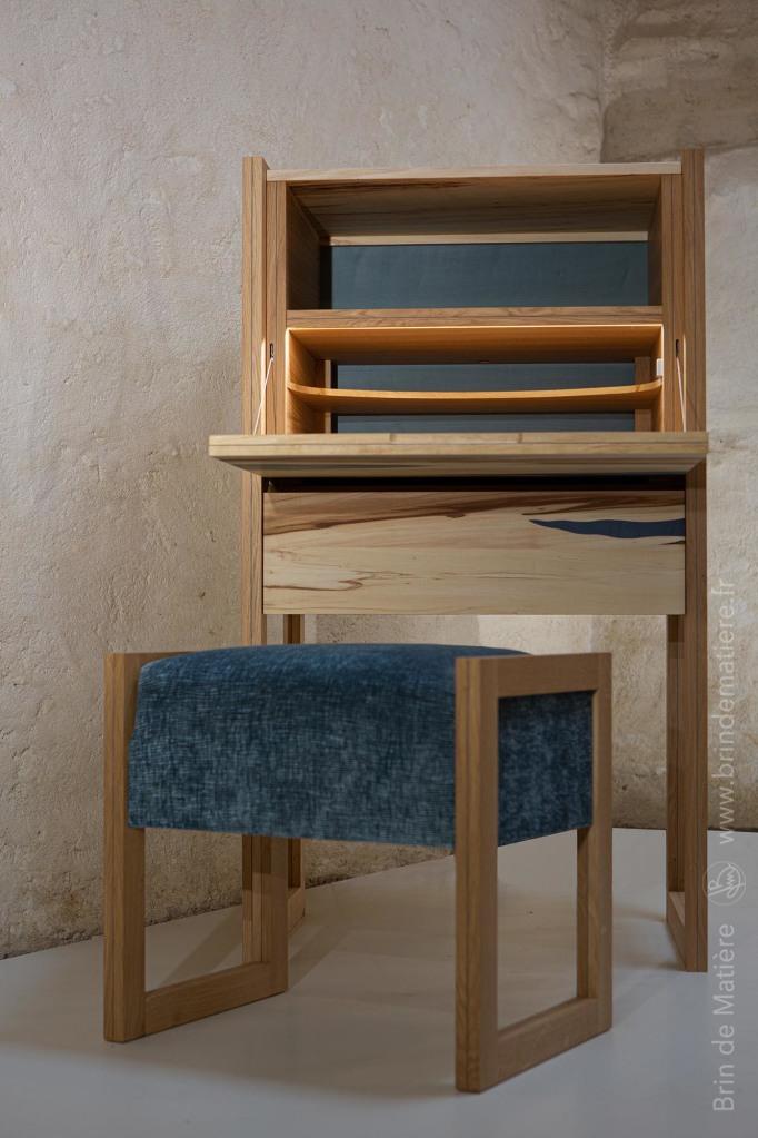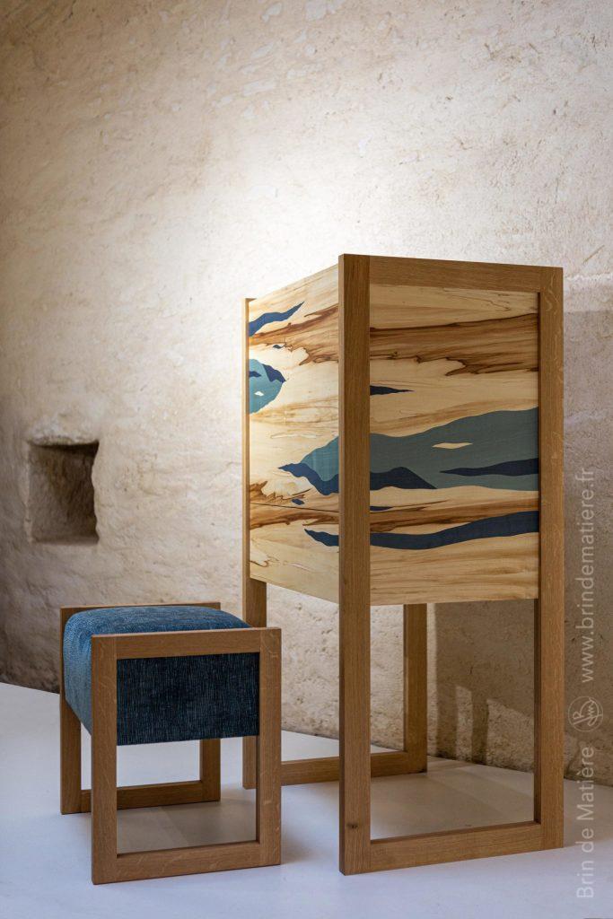 Secrétaire sur mesure marqueté avec son tabouret. Pièce sur mesure pour recevoir un poste informatique et son imprimante au dessus. Marqueterie dessinée à partir d’un tableau : l’estuaire de la Gironde et ses bancs de sable. Création signée Brin de Matière.